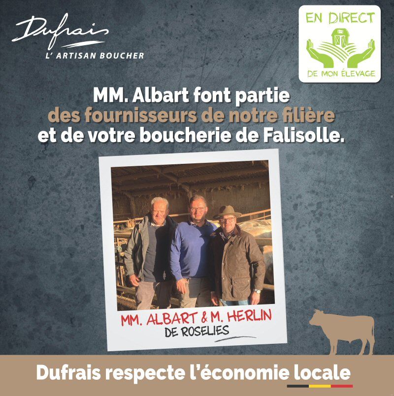 La famille Albart, aujourd’hui à la 4ᵉ génération d’éleveurs et d’engraisseurs, nous fournit principalement notre viande de bœuf locale pour la boucherie Dufrais au sein de votre Delhaize Falisolle.